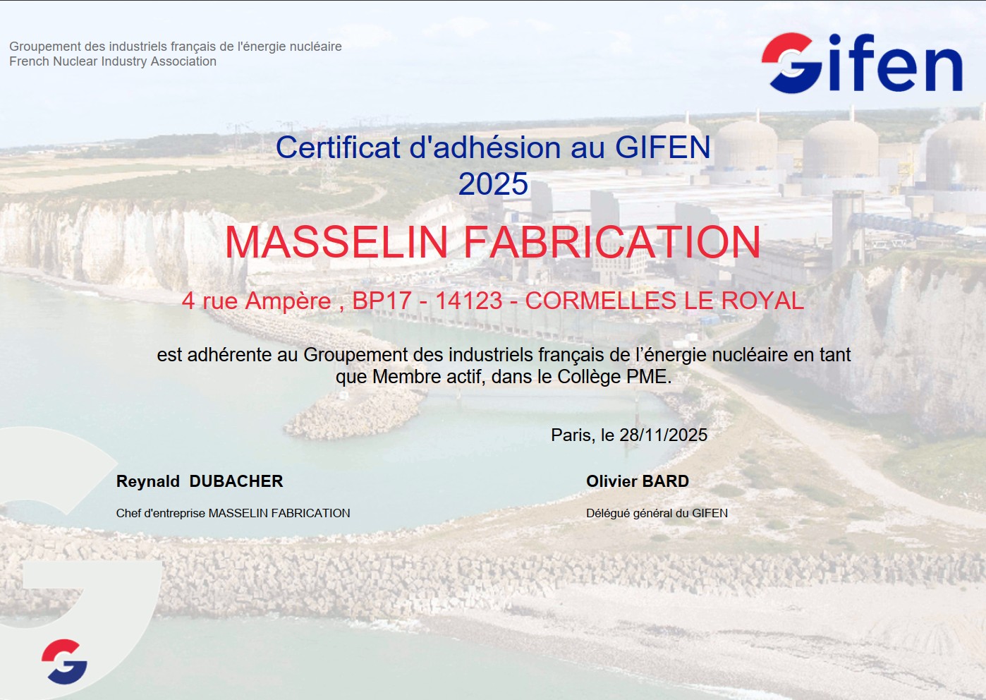 MLASSELIN FABRICATION est adhérent au Groupement des industriels français de l’énergie nucléaire en tant que Membre actif, dans le collège PME.